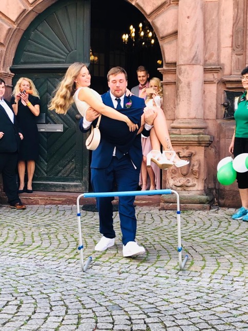 Am Samstag, 5. September fand im historischen „Alten Rathaus“, im Bürgersaal, hoch über der Altstadt von Gernsbach, die standesamtliche Trauung von Jessica Beeck und Bastin Wörner statt. Nachdem sie nach der Trauung die steilen Treppen des Rathauses herab gestiegen waren, blieben sie überrascht stehen. Unter Einhaltung des „Corona Abstandes“ waren Rasenkraftsportler des TV-Langenbrand und viele Leichtathleten/innen der LAG Obere Murg zum Spalier angetreten. Grün- Weiße Luftballons schmückten den Weg. Corsin Wörner hielt das Laudatio auf seinen Bruder mit dem Hinweis, dass 2021 bei den Deutschen Leichtathletikmeisterschaften im Hammerwurf wieder mit den Wörner-Brüdern zu rechnen sei. Bastian ist selbst nicht nur seit den Kindesbeinen aktiver Sportler, sondern auch seit vielen Jahren erfolgreicher Trainer. Corsin freute sich, dass Jessica ihren Bastin bei seinem Sport unterstützt und auch als Helferin bei den Veranstaltungen in Langenbrand in vielen Funktionen tätig ist. Bevor jedoch das Geschenk der Aktiven übergeben wurde erklärte Auli Weber dem Brautpaar, dass nun noch die letzte Hürde überwunden werden muss. Bastin nahm seine Jessica auf den Arm und überging die Hürde, nicht ganz im technischen Hürdenstil, aber dafür sehr sicher! Besser sah er dann bei den Wurfdisziplinen aus. Den Heuler warf er aus großer Distanz durch die Eheringe (Reifen) und auch beim Steinstoßen landete er sofort zwei Treffer. Damit stand der Übergabe des gemeinsamen Geschenkkorbes nichts mehr im Wege. Mateo Körner, einer seiner jugendlichen Schützlinge, übergab das gemeinsame Geschenk mit einem vielfältigen Inhalt für Braut und Bräutigam. Tobias Künstel und Joachim Wörner vertraten den Turnverein Langenbrand, den Stammverein von Bastin. Tobias Künstel gratulierte, im Namen des Turnrates, dem Brautpaar und betonte den starken Einsatz von Bastin für den Verein, denn Bastin ist nicht nur Sportler und Trainer, sondern gehört auch dem Dreiervorstandsteam des TV-Langenbrand an. Der Bräutigam bedankte sich, auch im Namen seiner Ehefrau, bei allen Anwesenden für die tolle Überraschung und die Geschenke. Die kirchliche Trauung findet am Samstag, 19.September in der Pfarrkirche St. Valentin Langenbrand im Familienkreis statt.