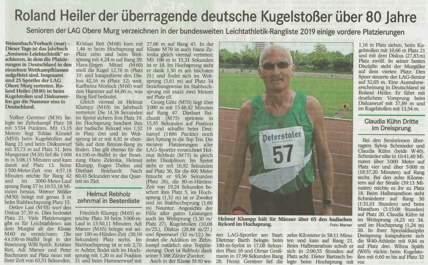 In der Männerklasse stieg Favorit Dennis Schober (ASV Landau) erst bei 5,04 Meter in den Wettkampf ein, als alle Konkurrenten bereits ausgeschieden waren. Doch der Sieger des Meetings von 2017 konnte drei Mal die Höhe nicht bezwingen und blieb ohne gültigen Versuch. So ging der Sieg an Fabian Brummer (LG Filstal) mit 4,64 Meter. Die Frauensiegerin machte es da besser: Salome Schlemer (LAZ Zweibrücken) gewann mit neuer Bestleistung von 3,74 Meter. Corona-bedingt ohne Zuschauer und eine Woche vor den Deutschen Meisterschaften auch ohne die in den Vorjahren anwesenden deutschen Spitzenathleten lag der Fokus des Meetings in Weisenbach damit auf dem Nachwuchs. Bei der männlichen Jugend U20 holte sich Sebastian Mergenthaler (LG Gäu Athletics) den Sieg mit 4,24 Meter. Der einheimische 4-Meter-Springer Paul Stößer (LAG Obere Murg) blieb dieses Mal bei 3,84 Meter hängen und wurde Dritter hinter Louis Lindner (LG Filstal, 3,94). Sieger der männlichen Klasse U18 wurde Lion-Jerome Tür (LG Neckar-Enz) mit starken 4,14 Meter. Bei der weiblichen U18 ging der Sieg an Martina Landt (LAZ Ludwigsburg) mit 3,24 Meter. Die Wertung der Jugend M15 gewann Robin Humbert (ASV Landau) mit 2,84 Meter. Besser waren jedoch M14-Sieger Caesar Konz (LGR Karlsruhe) mit 3,04 Meter und M13-Sieger Ben Silas Kribelbauer (Zweibrücken) mit 2,94 Meter. Hervorragend eingestellt war W15-Siegerin Jenna Fischer (Ludwigsburg), die starke 3,24 Meter überquerte. Joy Kessler (Neckar-Enz) gewann mit ebenfalls beachtlichen 3,04 Meter die Klasse W14 und Livia Anneliese Könsgen (Zweibrücken) entschied die W13 mit 2,54 Meter für sich. Auch die Nachwuchs-Kugelstoßer konnten mit einigen Bestleistungen aufwarten. In der männlichen Jugend U20 setzte sich mit der 6-Kilo-Kugel Felix Neudeck (LG Filstal) mit 13,79 Meter an die Spitze. In der weiblichen U20 gewann Josefa Metzinger (SR Yburg Steinbach) mit der 4-Kilo-Kugel mit 12,01 Meter. Bei den U18-Athleten zeigte Frederic Frey (LAG) mit der 5-Kilo-Kugel mit 11,68 Meter die größte Weite. Sein weibliches Pendant mit der 3-Kilo-Kugel war Eva Hoferer (LG Ortenau Nord) mit 12,26 Meter. Auf Platz zwei steigerte hier Carolina Kambeitz (TV Iffezheim) ihre letztjährige Bestweite um fast einen Meter auf 11,24 Meter. Auch Julia Wörner (LAG) als Dritte verbuchte mit glatten 11,00 Metern eine neue Bestweite. Sieger M15 wurde Nico Lanz (TV Gernsbach) mit 11,13 Meter.